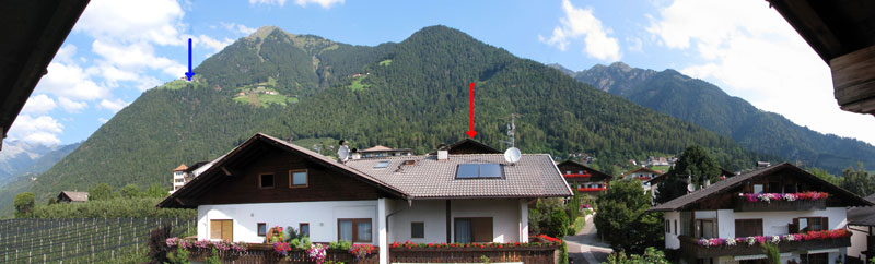 So ungefähr kann man den Weg und das Gefälle ahnen, wenn man von meinem Balkon (links und rechts) zurückblickt: