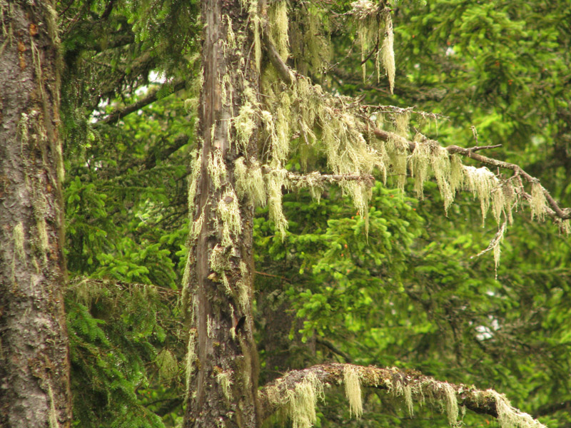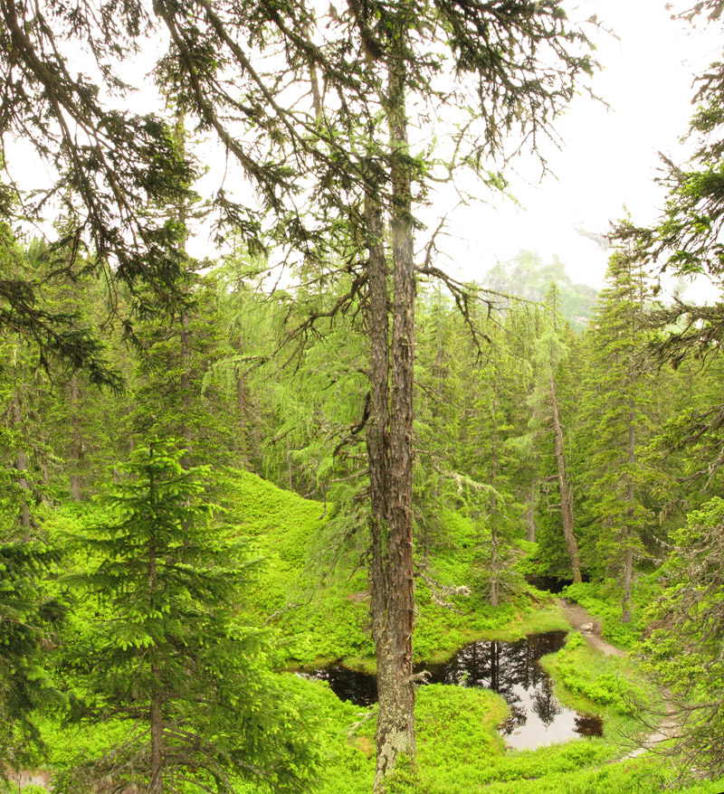 und im Hintergrund auf größeren Steinen Blaubeerbüsche und mit Flechten behangene Bäume.