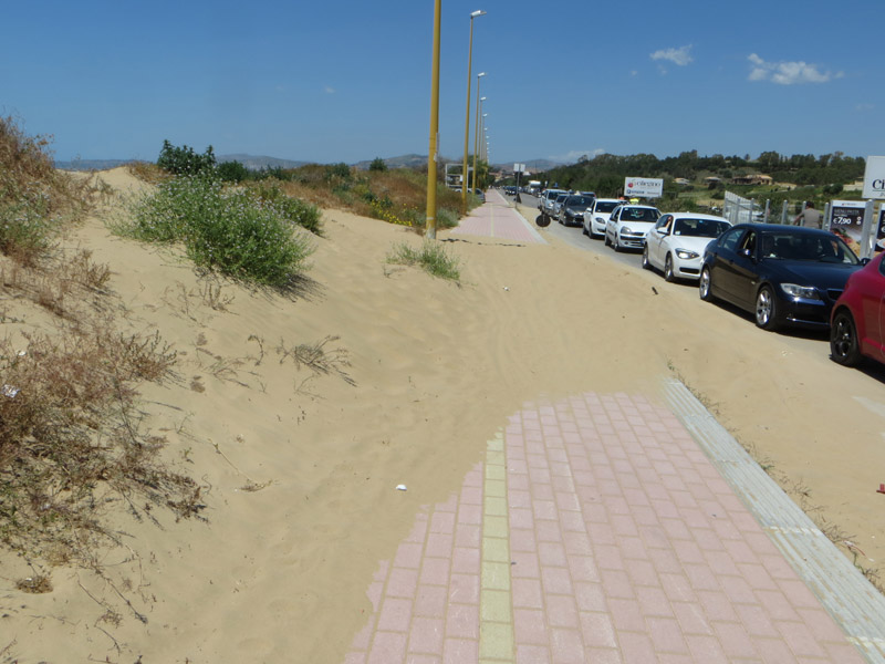 Auf dem Fußweg kann man sehen, dass Düne und Straße nicht immer der gleichen Meinung sind.