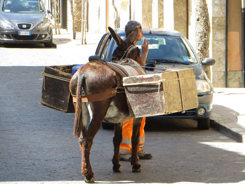 In Castelbuono ist gerade Müllabfuhr (ja, es gibt so etwas!), und die Leute ziehen mit dem Müllesel durch die engen