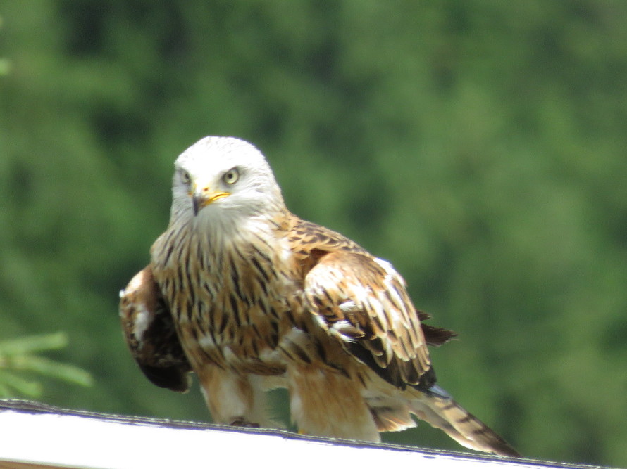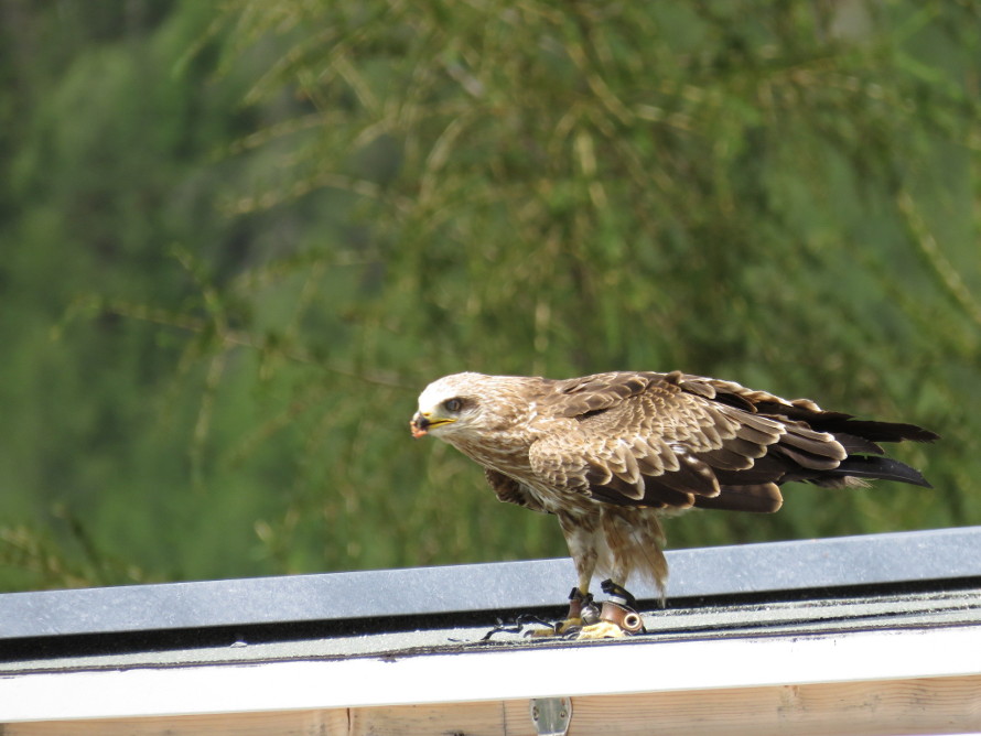 Ein Rotmilan auf dem Dach seines Käfigs.