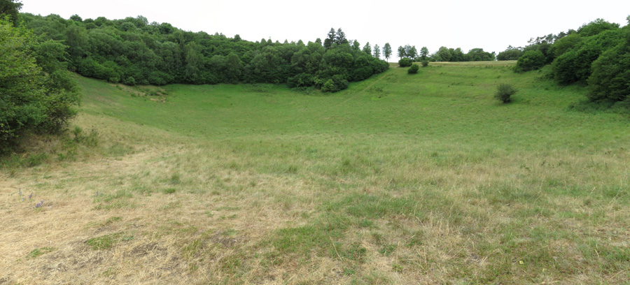 Eine Bodensenke (80 m breit und 20 m tief) mit einem leichten Wall
