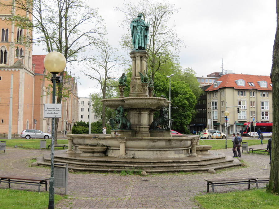 Heinrichsbrunnen mit einer Statue von Heinrich dem Löwen.