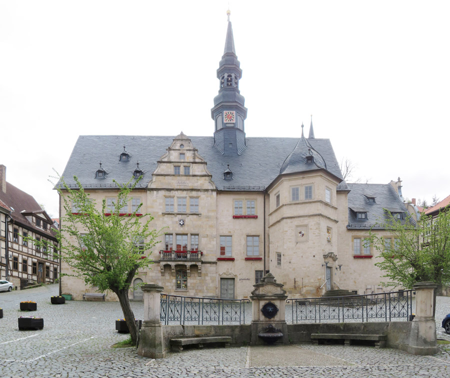 im Rathaus auch das Gericht sowie eine Markthalle und der Ratskeller