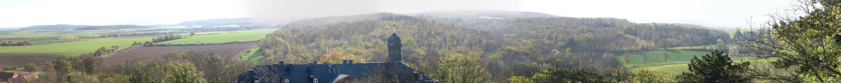 Ausblick vom Turm aus. Man erkennt das Dach des Schlosses und kann den