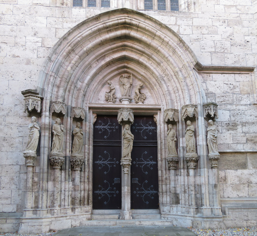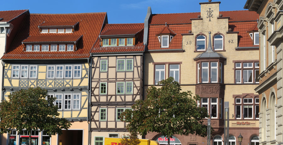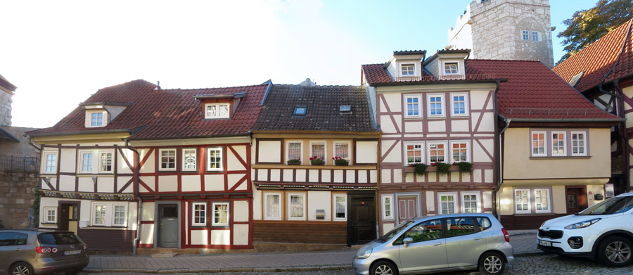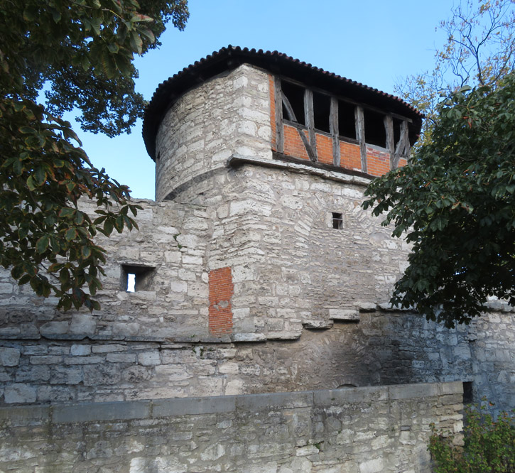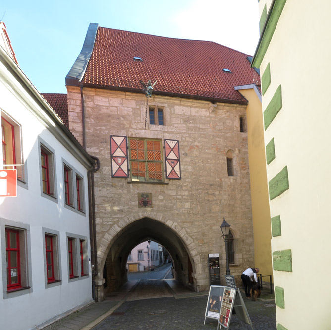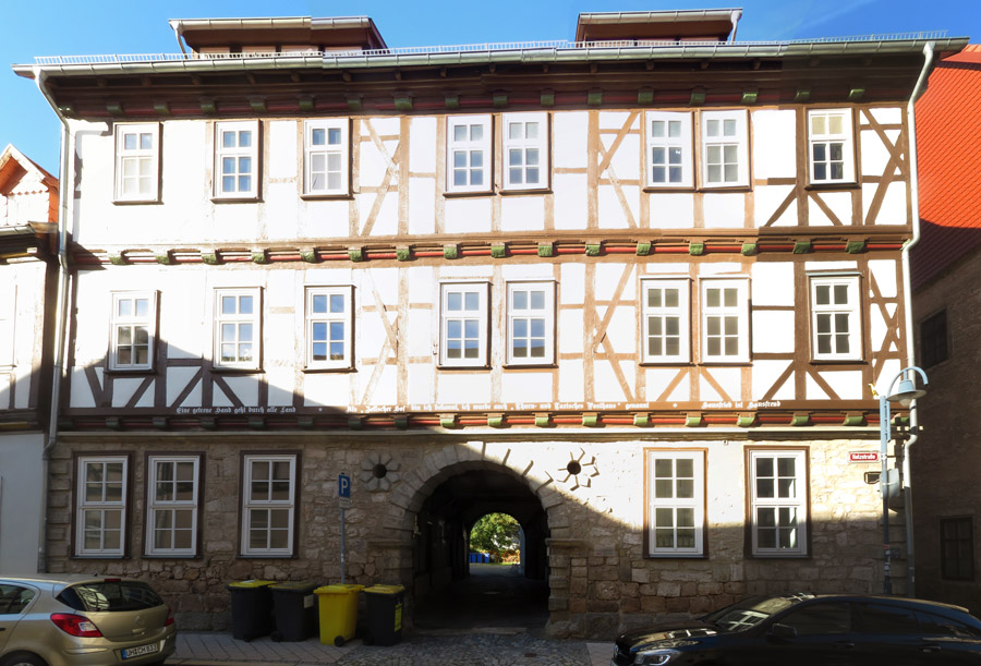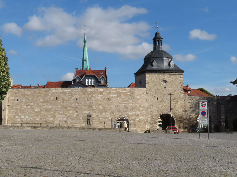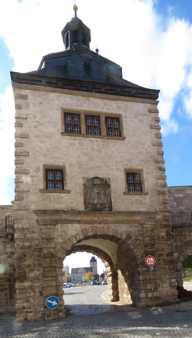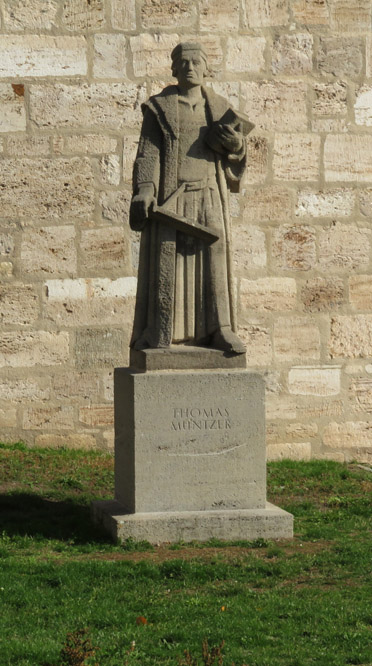 Thomas Müntzer: 1489 in Stolberg geboren, war zunächst ein Mitstreiter von Martin Luther. "Um 1513 wurde Müntzer in der Diözese Halberstadt zum Priester geweiht und war zunächst in Braunschweig an der Michaeliskirche tätig. Da dieses Amt seinen Lebensunterhalt nicht deckte, nahm er 1515/16 das Amt eines Präfekten im Kanonissenstift Frose bei Aschersleben an. Dort errichtete er eine kleine Privatschule, in der begüterte Bürgersöhne unterrichtet wurden. "Wegen Müntzers radikaler sozialrevolutionärer Bestrebungen und seiner spiritualistischen Theologie, die sich in vielen kämpferischen Texten und Predigten niederschlugen, distanzierte sich Luther zu Beginn des Bauernkrieges von ihm. Im Gegensatz zu Luther stand Müntzer für die gewaltsame Befreiung der Bauern und kämpfte auch selber mit. Er betätigte sich in Mühlhausen, wo er Pfarrer in der Marienkirche war, als Agitator und Förderer der Aufstände. Dort versuchte er, seine Vorstellungen einer gerechten Gesellschaftsordnung umzusetzen: Privilegien wurden aufgehoben, Klöster aufgelöst, Räume für Obdachlose geschaffen, eine Armenspeisung eingerichtet. Schließlich scheiterten seine Bestrebungen, als Bauernführer verschiedene Thüringer Freibauern zu vereinigen, an der Strategie des Adels. Nach der Schlacht bei Frankenhausen wurde er am 15. Mai 1525 gefangen genommen. Er wurde gefoltert und am 27. Mai 1525 öffentlich in Mühlhausen enthauptet. sein Leib aufgespießt und sein Kopf auf einen Pfahl gesteckt". Das geht aber auch nicht, dass jemand die christliche Leere von der Nächstenliebe einfach so ernst nimmt. Klar, dass so ein Kämpfer in der DDR hoch angesehen war. ![]() Er wurde auf dem 5 Mark-Schein und mit Gedenkstätten geehrt. Noch 1989 erschien eine Briefmarke zu seinem 500. Geburtstag und schon früher einige weitere Marken. So begrüßt Thomas Müntzer auch den Besucher Mühlhausens am Frauentor! |
