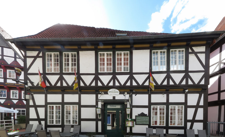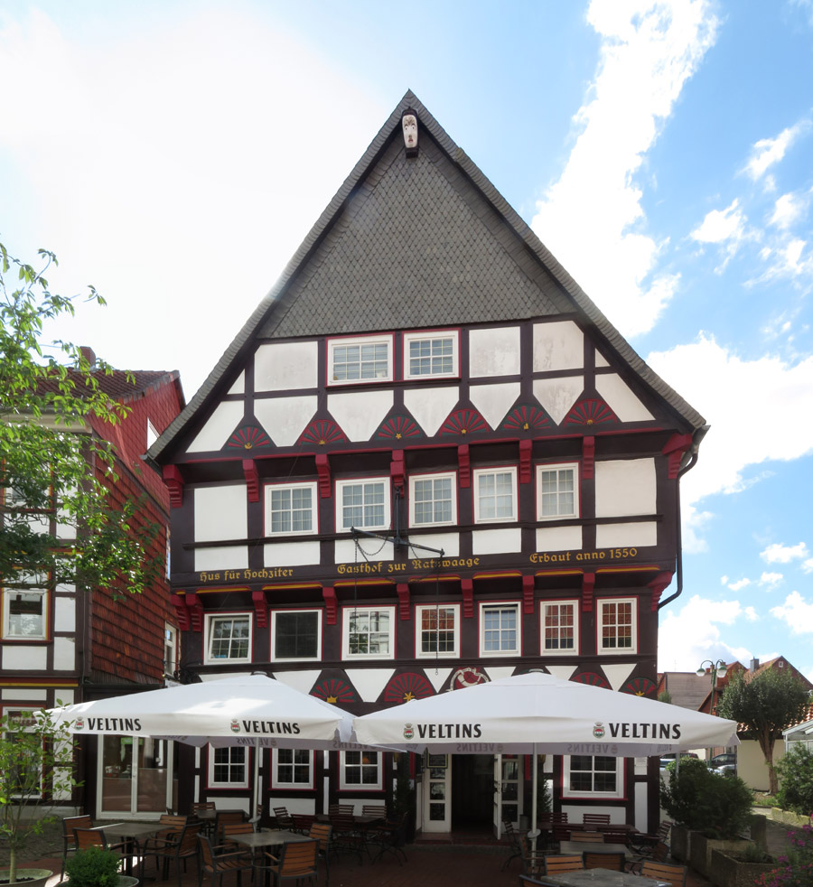 Die Ratswaage von 1550 ist heute von einem Gasthof besetzt, obwohl ganz oben im Giebel eine