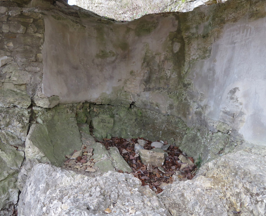 mit einer Mulde. Die Wand ist relativ glatt, was hier durch Verputzen