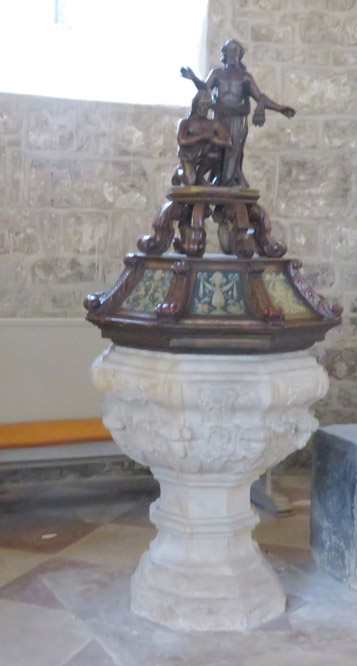 steht eine frühbarocke Sandsteintaufe in Kelchform.