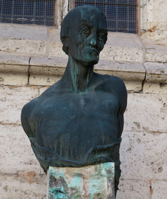 Vor der Kirche weist diese Büste auf den Bauernkrieg hin.