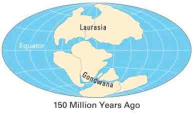 und Asien) und Gondwana (Südamerika, Afrika, und den heute noch zusammenhängenden Kontinenten
