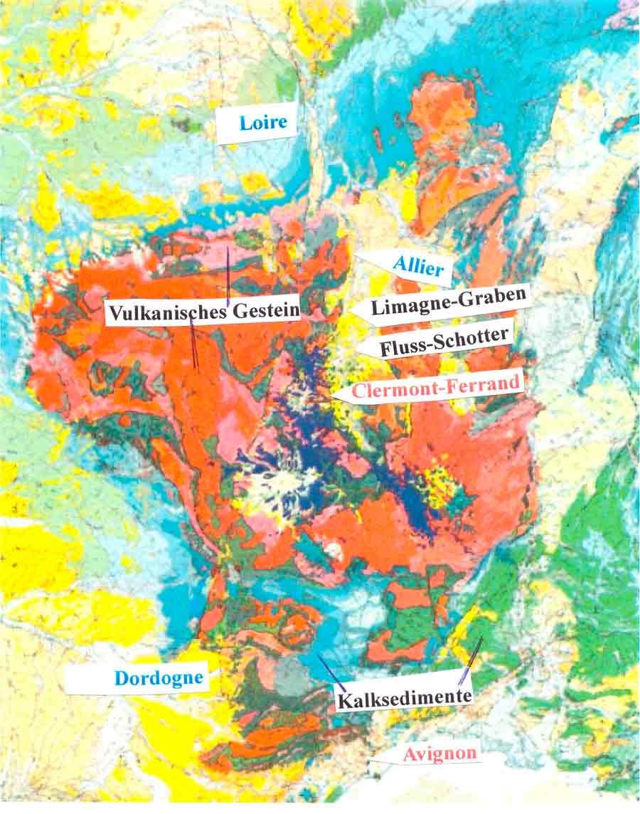 So stellt sich also heute die geologische Situation im Zentralmassiv (braun) und seinem Umland dar.