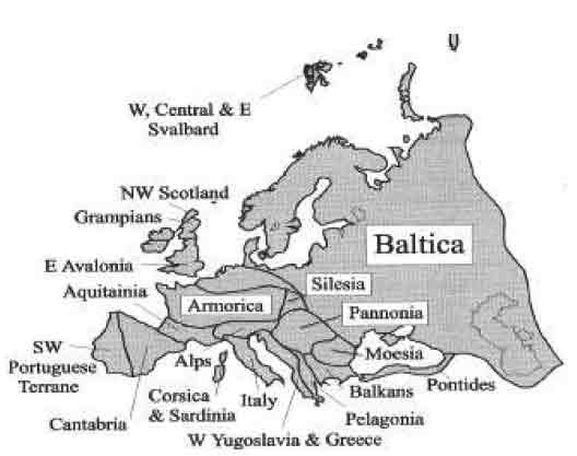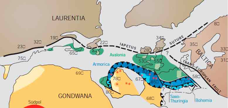 hier "Armorica" benannten Platten und grenzt heute an die "Avalonia"