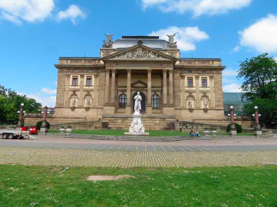 Das Wiesbadener Theater, mit Herrn Schiller davor.