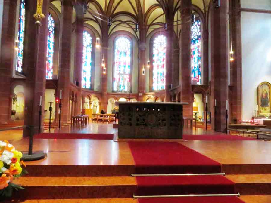 Innen ist die Kirche sehr dunkel, weil die farbigen Fenster kaum