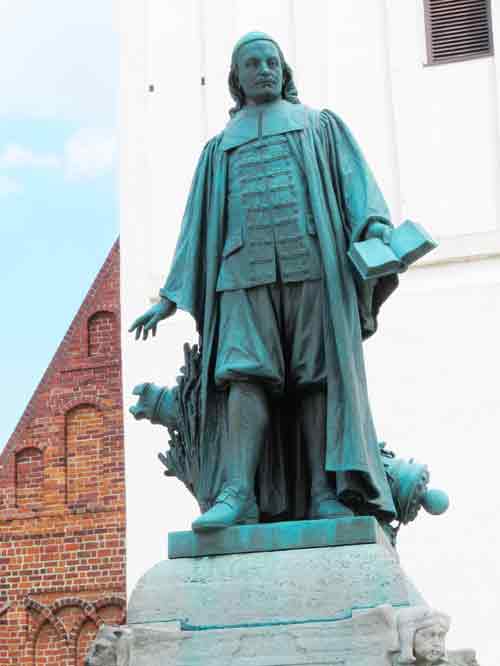 Vor der Kirche steht das Denkmal für Paul Gerhard.